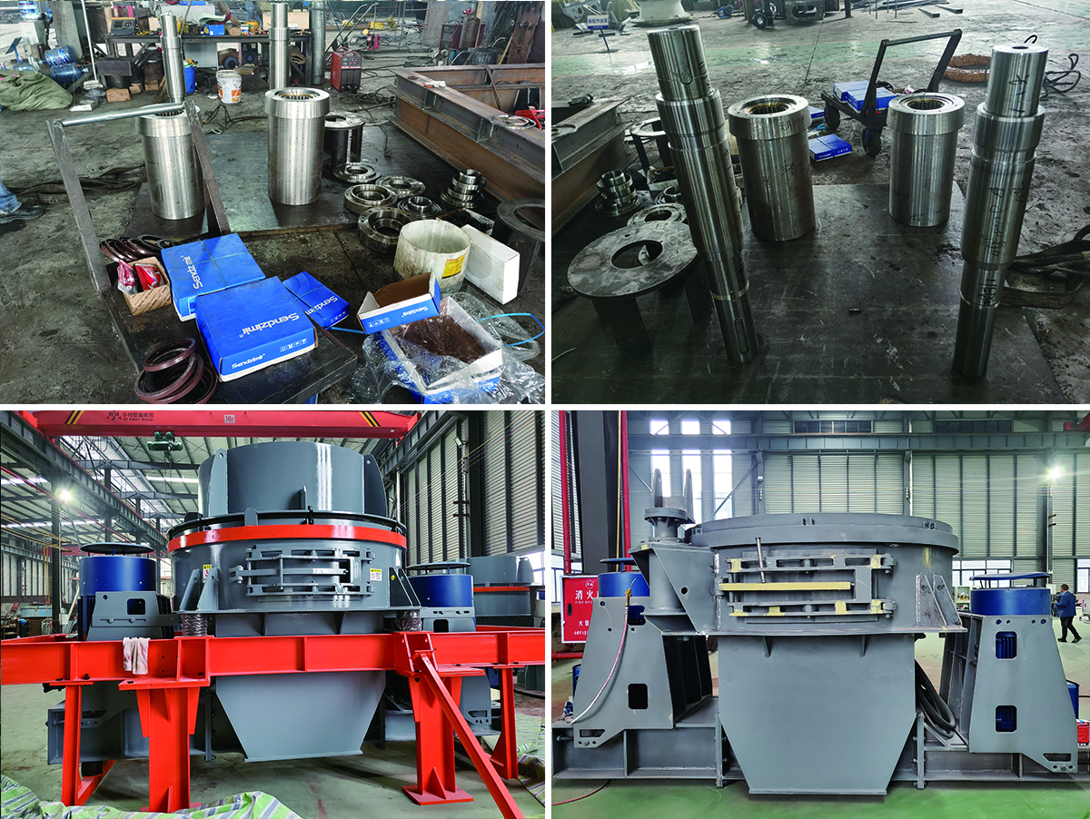 立軸式?jīng)_擊破碎機(jī)在使用時物料通過一個有物料村里的料斗給入破碎機(jī),料斗底部有液壓閘門控制給入轉(zhuǎn)子的物料量,物料在自身重力作用下給入進(jìn)料管,然后沿進(jìn)料管給到轉(zhuǎn)子,由電機(jī)驅(qū)動皮帶輪帶動轉(zhuǎn)子高速旋轉(zhuǎn)。物料進(jìn)入轉(zhuǎn)子后,在高速旋轉(zhuǎn)的離心力的作用下被加速到45-72米/秒。然后物料沿著轉(zhuǎn)子的導(dǎo)流板高速拋射。從轉(zhuǎn)子發(fā)射出的高速物料與破碎腔內(nèi)堆積的物料或者護(hù)板發(fā)生激烈的撞擊,通過石頭的高速碰撞產(chǎn)生沖擊、劈裂和研磨作用,從而達(dá)到破碎的目的。